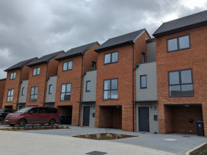 New redbrick terrace houses in Milbourne Close, with parking out front including charging pods for each space.