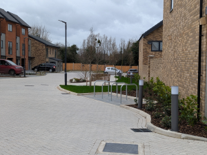 The new road linking the houses in Milbourne Close, with landscaped features, a bench, and cycle rack.